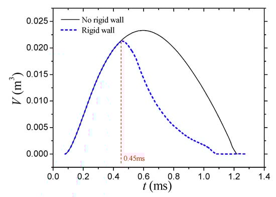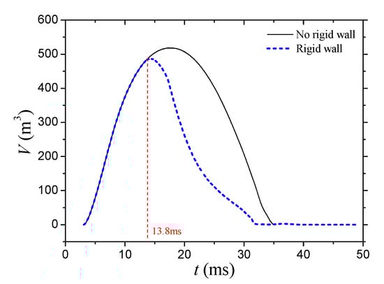 The interplay between the charge size and water depth creates an interesting dynamic in cavitation formation. While a larger charge generates a stronger shock wave, which would typically lead to more significant cavitation effects, the greater water depth weakens the shock wave’s propagation towards the free surface. These counteractive effects result in a complex cavitation pattern that varies depending on the specific conditions of the underwater explosion. To delve deeper into the influence of charge size on cavitation, a simulation was conducted. Specifically, a 60 g TNT explosion at a depth of 1 m underwater was studied. By analyzing the evolution of cavitation in this scenario, we aimed to gain insights into the relationship between the charge size and cavitation dynamics near the free surface. Furthermore, we examined the impact of a rigid wall on the cavitation evolution process. By comparing scenarios with and without a rigid wall, we sought to understand how the presence of a boundary surface affects the cavitation characteristics. Important features, such as the cavitation duration, total volume, and collapse pressure, were scrutinized to assess the influence of the rigid wall on the cavitation behavior.