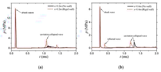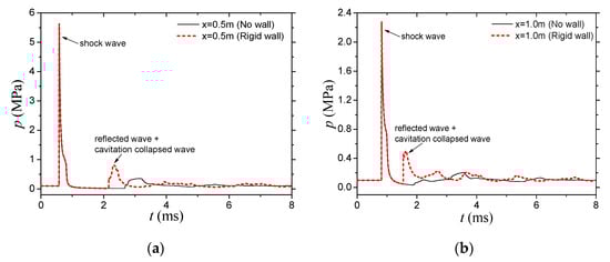 Figure 7 displays the pressure–time history curves at underwater measurement points located at depths of 0.13 m and 0.4 m from the axis of symmetry, respectively, under the aforementioned two conditions. In the left picture of Figure 7, it can be observed that cavitation collapses earlier in the presence of a rigid wall, with the collapse pressure significantly higher than that without a rigid wall. The maximum cavitation pressure increases from 0.98 MPa to 3.7 MPa. The right figure in Figure 7 demonstrates that the reflected shock wave reaches the measurement point at t = 0.4 ms due to its distance of 0.5 m from the wall. Additionally, the existence of the rigid wall causes cavitation to collapse at an earlier stage.