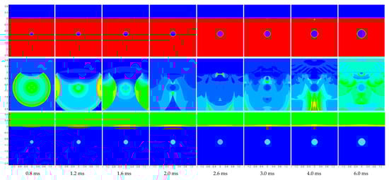 In Figure 14, except for the left boundary, which is assigned a symmetrical boundary condition, all other boundaries are set as non-reflective boundary conditions. This configuration allows for the accurate representation of the explosion dynamics and the resulting cavitation evolution in an unrestricted environment. Figure 15, on the other hand, incorporates the presence of a rigid wall. In this case, the left boundary is a symmetrical boundary, the right boundary represents the rigid wall condition, and the upper and lower boundaries are the non-reflective boundary conditions. This setup allows for the examination of the interaction between the explosion, cavitation, and the rigid wall.