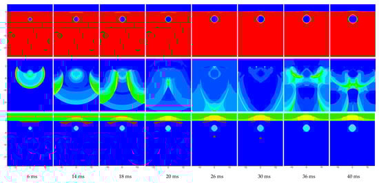 Figure 16 and Figure 17 depict the evolution of the flow field density, pressure, and cavitation domain under two different operating conditions. The selected flow field size and position are identical in both cases. Prior to t = 14 ms, it can be observed that the cavitation domain is similar under the two operating conditions. However, at t = 14 ms, the reflected wave from the solid wall boundary is fully reflected into the cavitation domain. From this point onwards, due to the propagation of reflected waves within the cavitation domain, the boundary of the cavitation domain with the wall appears smoother and more rounded compared to the sharper boundary shape observed in the free-field condition. At t = 26 ms and 30 ms, a noteworthy observation is the emergence of a new cavitation region beneath the explosion bubble in the case with the wall. Additionally, the cavitation domain above the bubble is larger compared to the free-field condition. At t = 36 ms, the cavitation domain vanishes under both operating conditions, yet there is a noticeable difference in the pressure distribution within the flow field. In the case of a free-field explosion, a high-pressure zone emerges in the area above the bubble. Conversely, in the case with a rigid wall, high-pressure zones appear on both sides below the bubble. This discrepancy arises primarily from the contrasting effects of the reflected wave on the wall and the cavitation collapse load.