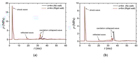 Pressure–time history curve of the measurement point at distances of 4 m (a) and 8 m (b) from the symmetry axis, at a depth of 2.0 m from the free surface.