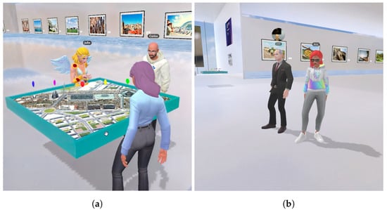 Figure 1. Example of interaction in the metaverse: virtual visit to Valencia city in the following. https://www.spatial.io/s/Visit-Valencia-639b11ab10f4070001b4a87b?share=8520243597075764882 (accessed on 19 February 2024). (a) Users interacting with elements in the metaverse. (b) Customized avatars.