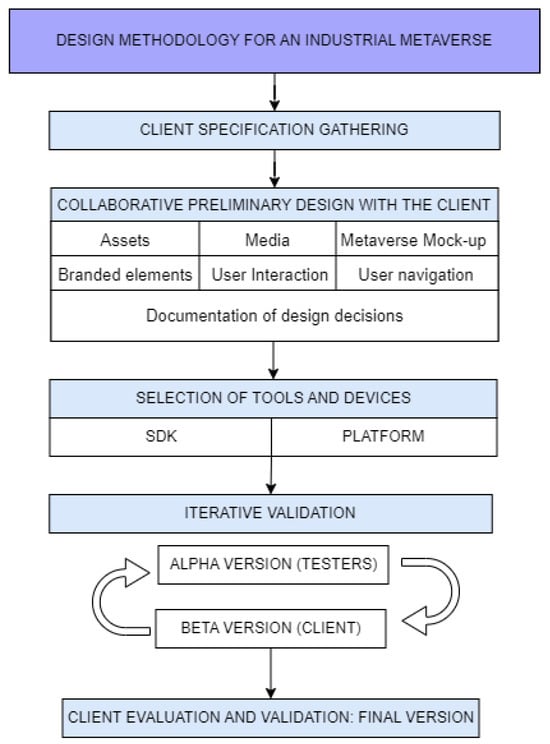 The methodology proposed in this work for designing an industrial metaverse is graphically depicted in Figure 3, which shows the systematic progression through key phases. It initiates with client specification gathering, involving the establishment of initial contact to comprehensively understand the client’s specific needs and vision for utilizing the virtual environment. Following this, the collaborative preliminary design phase unfolds, where, based on the client’s specifications, a joint effort is made to conceptually outline each element of the metaverse without delving into programming. Mock-ups are generated during this phase, providing a tangible representation for client feedback before transitioning to the subsequent development stage. After the client’s validation, the selection of tools, software development kits (SDKs), platforms, and hardware is carefully undertaken, ensuring technical viability and effectiveness for the industrial metaverse’s unique requirements. The implementation phase starts, presenting an alpha version for validation by testers and subsequently generating a beta version for client validation. This iterative process incorporates feedback, addressing necessary adjustments and refinements. The evaluation and delivery phase involves subjecting the beta version to a thorough evaluation during an agreed-upon period with clients and testers, culminating in the delivery of the finalized industrial metaverse. The methodology concludes with a prolonged validation period and continuous improvements, where the final version undergoes extended validation by users within the industrial environment, with ongoing refinements based on user feedback to ensure continuous adaptation and optimal efficiency.