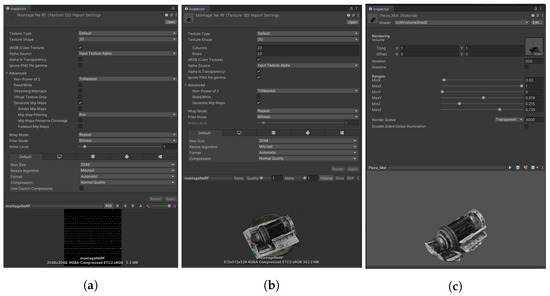 In the fourth phase of the process (S4), the creation of the 3D texture is started from the previously exported slices. The initial step involves generating a mosaic of the exported slices, shown in Figure 7. This mosaic will subsequently be introduced to Unity as a 2D texture, serving as the foundation for creating the required 3D texture for the NeRF object representation. Following the introduction of the mosaic to Unity, necessary adjustments such as size and alpha channel can be made, resulting in the desired 3D texture for the NeRF object, see Figure 8a,b. To generate the mosaic, Image Magick [22] has been employed, although any image editor can be utilized.