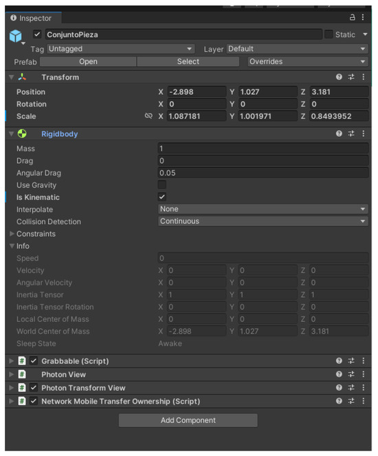 In the final phase (S6), the focus shifts to configuring the GameObjects to become a shared resource accessible to all users within the metaverse. Specific components, as illustrated in Figure 10, are added to the GameObject. Additionally, various grab points have been strategically created on the GameObject, enabling users to interact from multiple angles.