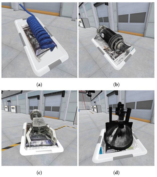 It is worth noting that, to enhance usability and ensure a satisfactory user experience when interacting with the proposed industrial models, a tray with only four grip positions has been implemented. These positions are indicated by gray handles on the tray, as illustrated in examples in Figure 12. When the user grasps the object at one of these positions on the tray, it automatically aligns so that the handgrip and the handle coincide, replicating the experience with a real handle. Additionally, the tray consistently positions itself to ensure that the model is always visible on top of it, facilitating continuous user engagement with the model (refer to Figure 13e). This design approach eliminates awkward viewing and gripping scenarios, preventing user distractions and maximizing the focus on the training content.