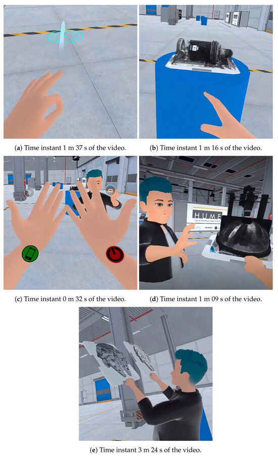 Figure 13 shows several captured moments from the user experience for various actions within the metaverse. In particular, Figure 13a depicts the hand gesture required for spatial navigation within the virtual environment. This not only broadens the age range of users but also grants complete freedom for natural interaction with virtual objects and avatars. In Figure 13b, one of the 6D models distributed across the industrial metaverse is showcased. Each model is positioned on a tray atop a pedestal, with the trays featuring grip points for user interaction. Figure 13c displays the available options panel within the metaverse, triggered when the user places both hands in front of their field of view. Pressing the green button activates a mobile device, allowing users to take photos to save images of the training session for later use. The red button allows users to exit the virtual space. Figure 13d,e illustrate user interaction with elements within the space: the first one shows user-to-user interaction, passing a model from one user to another, whereas the second one depicts a user comparing two 6D models, manipulating both simultaneously. Note that during the session, the users interact with each other by communicating verbally, explaining details of the actions and training provided. This can be observed at various moments in the demonstration video.