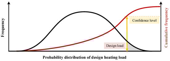 Finally, it is necessary to determine the heating design load value for rural residential buildings. Based on the probability distribution of design heating loads in Section 2.2, the design load value was selected in accordance with a certain confidence level to guide the design capacity determination of the building heating system. The specific process is shown in Figure 2. Here, the confidence level indicates the probability that the selected design value is not exceeded in the probability distribution of design heating loads, which is calculated as follows: