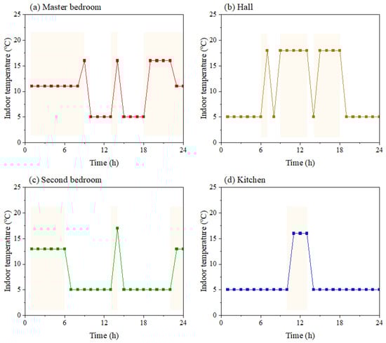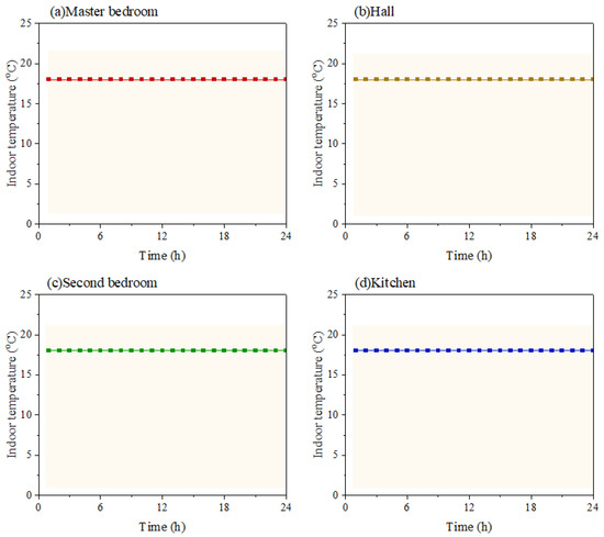 In order to verify the effectiveness of the new method in this study, a traditional design load calculation method corresponding to the “all-time, all-space” heating mode was used as a control. In this traditional method, the indoor temperatures of the master bedroom, hall, second bedroom, and kitchen were kept constant at 18 °C, as shown in Figure 7.