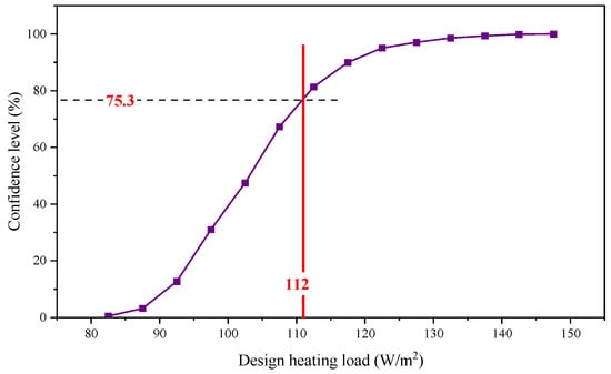 As can be seen in Figure 8, the design load of the traditional method is 112 W/m2. This value is within the range of the new method of this study, and therefore the corresponding confidence level can be calculated, which is 75.3%. This means that the design capacity of the heating system for this rural residential building using the traditional method only ensures a 75.3% chance that the system will be reliable in actual operation. Such a low level of reliability may not be expected by the designer, but the designer is not able to propose a reasonable improvement based on the traditional method. In contrast, the new method in this study provides a confidence level for each design load value, which guides the designer in making specific decisions to reduce or increase the design capacity based on reliability and economic needs.