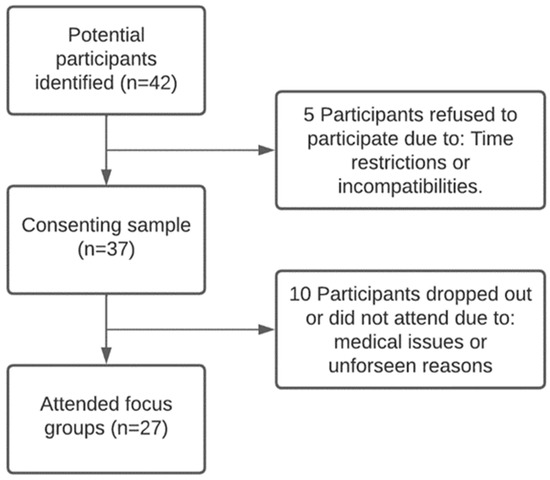 Out of the initial sample of 42 eligible participants, 27 participated in this study. The progress of the selection stages and the reasons for non-participation are presented in Figure 1. Table 2 summarizes the demographic characteristics of the participants in the focus groups. They had an average of 18.7 years of clinical experience; a big majority of participants were owners/managers (18) of physiotherapy centers. Recruitment stopped when saturation was reached, which was when no new categories or coded statements were identified. The analyses showed the adequacy and generalizability of the content, and sufficient depth of understanding was achieved in the emergent theoretical categories [30].