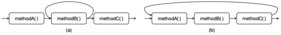 At the same time, our method supports the analysis of direct and indirect recursion. On the call chain, direct recursion and indirect recursion have the following characteristics: direct recursion has the characteristic of explicit self-calling in the figure, and indirect recursion may achieve self calling through complex indirect calls. Figure 2a shows “methodB()” directly recursively calling itself, while Figure 2b shows “methodA()” indirectly recursively calling itself by calling “methodB()” and “methodC()”.