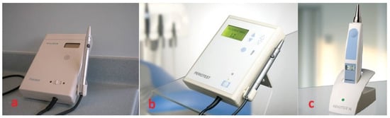 - Andresen, M.; Mackie, I.; Worthington, H. The Periotest in traumatology. Part II. The Periotest as a special test for assessing the periodontal status of teeth in children that have suffered trauma. Dent. Traumatol. 2003, 19, 218–220. [Google Scholar] [CrossRef] [PubMed]