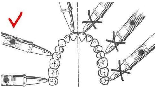 Correct positioning of the handpiece on the surface of the teeth (© Periotest Operating Instructions Manual). X marks the spot where the handpiece should be placed on the surface of the teeth.