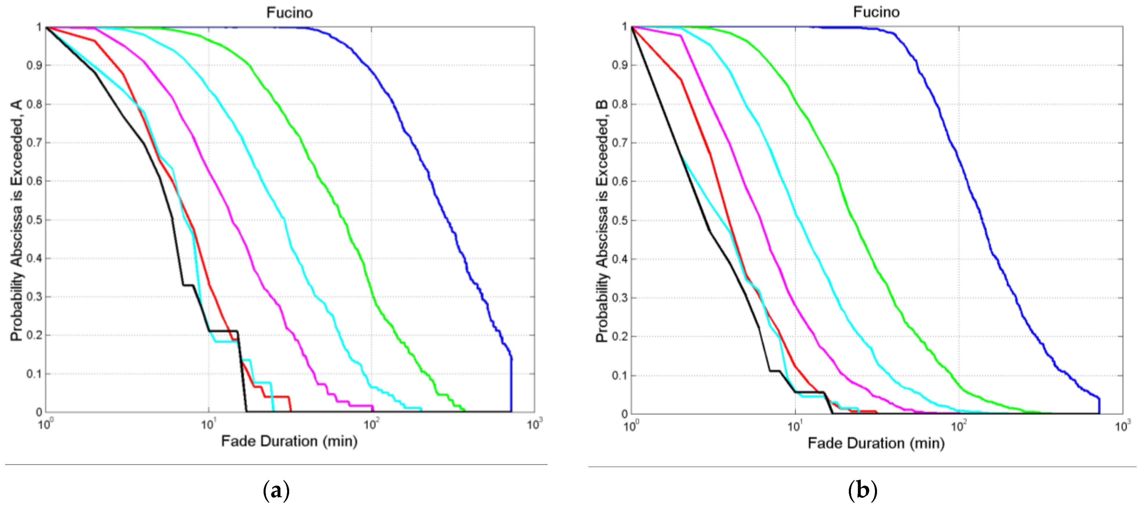 - As fade duration increases, curves tend to collapse, in agreement with the probability distributions shown in Figure 4a,b. For example, the curves regarding min tend to coincide.