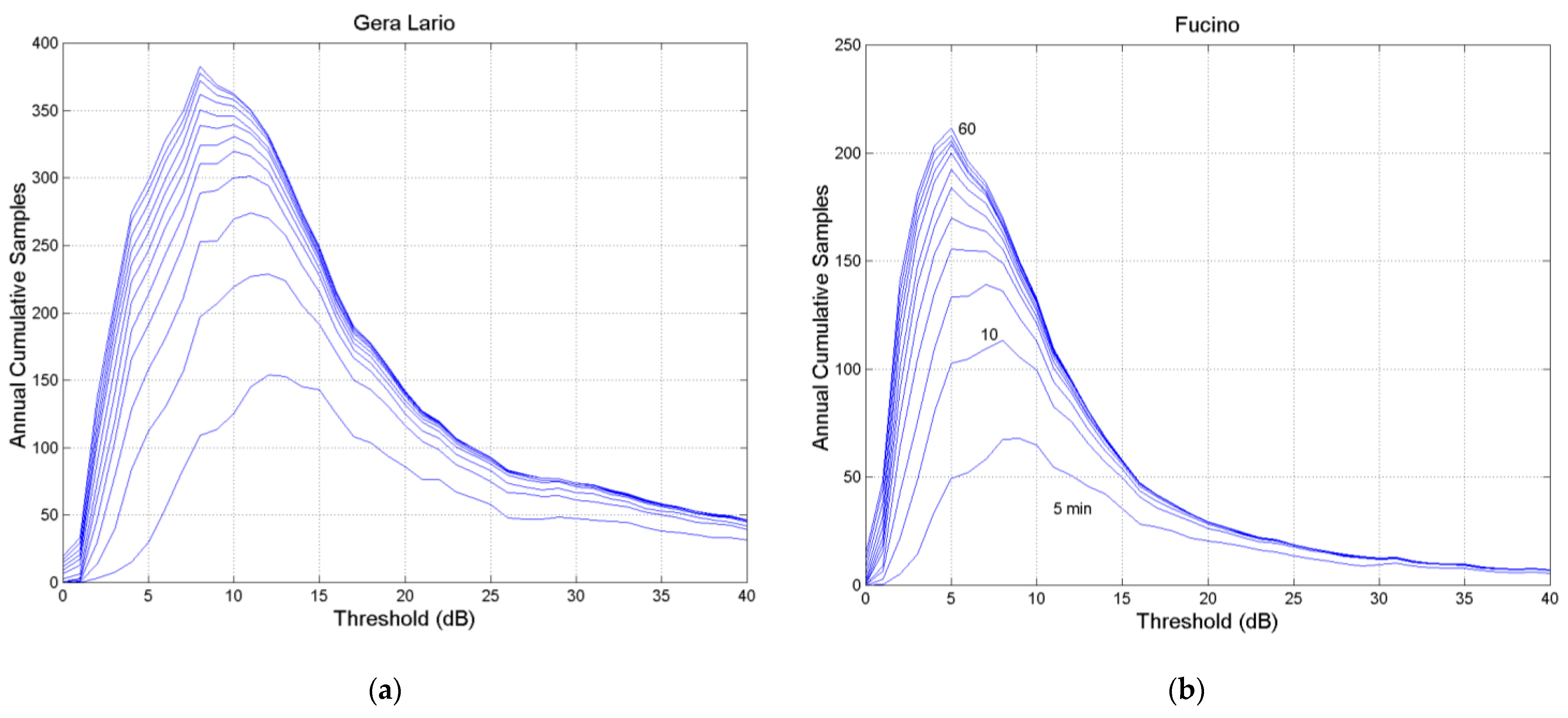 - Matricciani, E. Duration of rain–induced fades of signal from SIRIO at 11.6 GHz. Electron. Lett. 1981, 17, 29–30. [Google Scholar] [CrossRef]