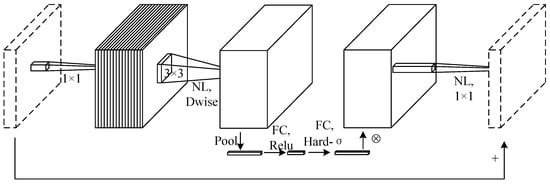 As illustrated in Figure 2, MobileNetV3 incorporates the Squeeze and Excitation Network (SENet) [31] after depth-wise separable convolutions. This integration allows for the adjustment of the weights in different channels, facilitating a focused emphasis on relevant channels. Additionally, to enhance the model’s computation speed, some swish activation functions are replaced with hard swish activation functions.