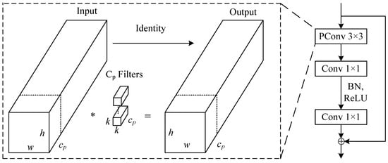 Chen et al. [24] introduced the FasterNet block, a neural network module that incorporates the PConv convolution technique. This integration is designed to enhance the model’s computation speed without compromising its accuracy. The structure of this module is illustrated in Figure 3. The utilization of PConv convolution within the FasterNet block contributes to efficient and rapid computation, making it a valuable component in the proposed model’s architecture.