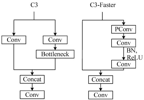 To enhance the network performance and reduce the number of parameters, the FasterNet block module is integrated into the original YOLOv5’s C3 module, resulting in the C3-Faster module. The network structure is illustrated in Figure 4. The incorporation of the C3-Faster module into YOLOv5s significantly improves the operational speed of the network. Simultaneously, it successfully reduces the number of parameters, contributing to a more efficient and accurate model.