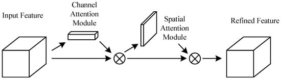 The convolutional block attention module (CBAM) is incorporated into the proposed model to address challenges posed by dim backgrounds and low-resolution images. CBAM enables the model to focus more on learning and extracting crucial features relevant to sewer defects. This becomes particularly crucial under low-resolution conditions, as CBAM is adept in capturing the features of sewer defects at lower resolutions. It takes into account differences between pixel categories, channel features, and contextual correlations. The structure of this module is illustrated in Figure 5.