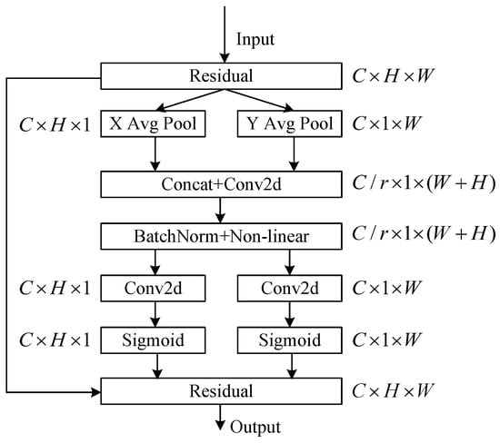 Additionally, the lightweight design of CA allows it to be easily integrated into existing network structures without significantly increasing the computational complexity. The structure of CA is illustrated in Figure 6. This integration represents a thoughtful enhancement, addressing the limitations of CBAM and improving the model’s capability to capture both channel-wise and spatial dependencies for more effective sewer defect detection.