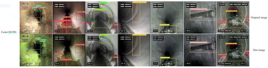 The detection results of sewer defects using different models, including original image and dim images.