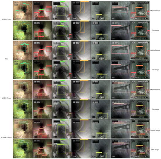 There are a total of 10 rows of images in Figure 8, with each two rows representing the detection results of a model. The first and second rows depict the detection results of the original image and the image under dim conditions, respectively. As shown in the image in column 7, there are underwater cracks. The dim condition image intentionally diminishes the brightness and tone of the original image. Based on the outcomes of the sewer defect detection, the YOLOv5-Sewer model can successfully identify eight types of sewer defects with a low miss rate, even in dimly lit conditions. Consequently, the YOLOv5-Sewer model exhibits strong performance in tasks related to sewer defect detection. Therefore, YOLOv5-Sewer successfully achieves model lightweighting with acceptable accuracy loss. The YOLOv5-Sewer model is more suitable for rapid defect detection on portable on-site devices.