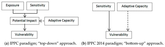 These approaches relate to the vulnerability framework proposed by the Intergovernmental Panel on Climate Change (IPCC). To date, two frameworks have been proposed, the first in the Fourth Assessment Report (IPCC 2007) [9] and the second in the Fifth Assessment Report (AR5) (IPCC 2014) (Figure 1) [10]. In the IPPC 2007 framework, vulnerability is conceived as a function of exposure, sensitivity, and adaptive capacity, while IPPC 2014 separates exposure from vulnerability, and vulnerability is therefore a function of sensitivity and the capacity to cope and adapt. Both frameworks have been widely used, depending on the risk assessment context and approach [11].