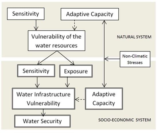 Rivers and socioeconomic systems are dynamic and constantly adapting to climate and other changes. The resulting water security state is a consequence of the interaction between the water resource system (physical) and the socioeconomic system, which addresses water stress and availability, vulnerability to hazards, water demand, and sustainability dimensions, as shown in Figure 2. Key issues are the risk and uncertainty in water resource systems related to streamflow and design parameters. Risk results from the interpretation of vulnerability (a function of sensitivity and adaptive capacity), exposure, and hazard [10]. With this approach, resilience and vulnerability are considered additional engineering performance criteria in the planning process of adapting or adjusting to the actual or expected climate and its effects.