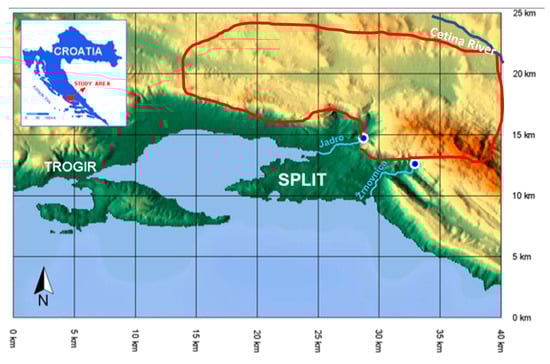 The Jadro Spring is situated on the hillside of Mosor Mountain at an elevation of approximately 33.00 m a.s.l., 3 km east of the Adriatic coast, in the vicinity of the city of Split, Croatia, Figure 3 [21]. According to various authors, the total area of the Jadro and Žrnovnica Spring catchments is approximately 450 km2 [25]. According to the Köppen classification, the climate is classified as Csb/Csa, where Csa and Csb are Mediterranean climates with hot and warm summers, respectively. The total annual precipitation is approximately 1200 mm, and two-thirds of the total precipitation occurs from September to March.