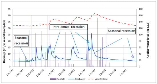 Discharge hydrograph, rainfall, and aquifer water level from 1 September 2011 to 31 August 2012.