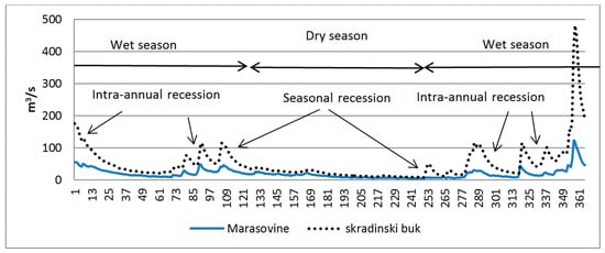 Hydrograph of the Krka River at Marasovine station (41 km from estuary) and Skradinski Buk station (5 km from estuary), calendar year 2002.