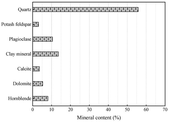 Waste soil, in appearance, is grayish yellow or greenish gray with plastic, medium toughness and strength. The mineral composition of the waste soil was assessed through X-ray quantitative phase analysis and consisted of approximately 13.6% clay minerals and 86.4% non-clay minerals, including quartz (55.8%), plagioclase (10.5%), hornblende (8.2%) and other minerals, as depicted in Figure 2. The gradation curve obtained from sieve tests is shown in Figure 3, with a d10, d30 and d60 of 0.007, 0.02 and 0.12 mm, respectively. The coefficient of uniformity Cu and coefficient of curvature Cc were determined to be 17.1 and 0.476, respectively, which are calculated using the following formula: