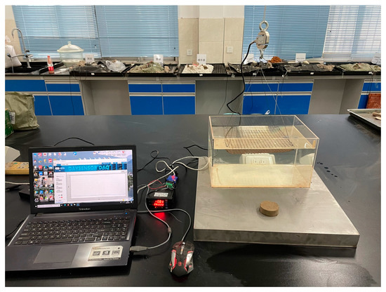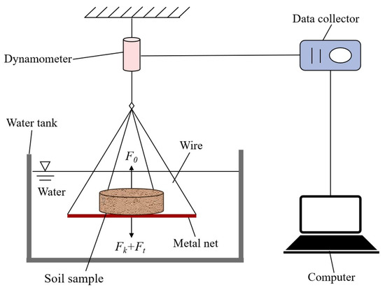 A self-made disintegration system (see Figure 4 and Figure 5), which is mainly composed of an acrylic water tank (length 38 cm, width 26 cm, height 20 cm), metal net (length 25 cm, width 20 cm), wire, dynamometer, data collector and computer, was adopted. This disintegration device eliminates the inaccurate dynamic measurement of the measuring cylinder device recommended by “Test Methods of Soils for Highway Engineering” [40] and allows for different specimen sizes. The soil sample was placed in the center of the hanging basket net, about 20 cm from the bottom of the water tank. The force sensor is connected to the hanging metal net to measure the weight change of the soil sample. After debugging the sensor and data collector, the water tank was quickly filled with tap water, and the data started to be recorded at the frequency of 1 Hz when the soil sample was put into the water. The disintegration process could be observed and photographed until the soil sample is completely disintegrated. The disintegration ratio was calculated as follows: