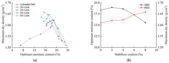 Results of compaction tests of stabilized silty clay with lime: (a) Compaction curves; (b) Influence of stabilizer content.