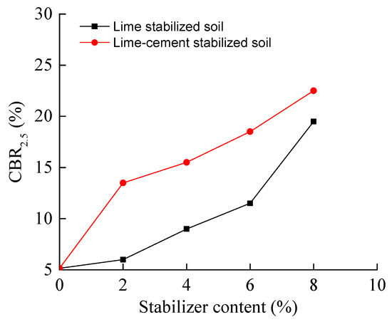 Figure 8 provides an overview of the CBR2.5 (California bearing ratio at 2.5 mm penetration) of the stabilized soil at different stabilizer contents. The CBR of the lime-stabilized soil demonstrates a non-linear growth pattern as the lime content ranges from 2% to 8%. With an 8% lime addition, the CBR2.5 of the soil rises from 5.1% to 18%, exhibiting an increase of up to 3.5 times greater than that of the untreated soil. This enhancement can be attributed to the occurrence of ion exchange and gelation reactions between the soil and lime, where individual soil particles are aggregated into small agglomerates, thus forming a more stable structure [8,12]. Over time, the formation of denser crystals further enhances the strength of the lime-stabilized soil.