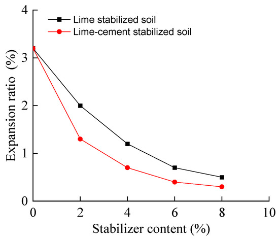 The waste soil presented a decrease in expansion ratio after the addition of stabilizers, as illustrated in Figure 9. Notably, the two types of stabilized soils demonstrated the most substantial reduction in expansion ratio at a stabilizer content of 2%, while minimal changes were observed when the content surpassed 6%. Specifically, for lime-stabilized soils, the expansion ratio decreased from 3.2% to 2% and 0.5% with the addition of 2% and 8%, respectively. In contrast, the composite stabilized soil exhibited a smaller expansion ratio, with the minimum value being merely 0.3% when utilizing a stabilizer content of 4% cement + 4% lime.