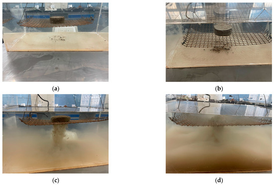The disintegration breakage of the typical stabilized silty clay during the disintegration tests was demonstrated in Figure 10. After immersing the specimen into the water, soil particles on the surface are softened and gradually peeled off into the bottom of the water (see Figure 10a), resulting in the surroundings of the specimen being cloudy immediately. The specimen continuously absorbed water, and the bubbles appeared to escape from the water surface, especially for the specimen with lower compactness. As the water absorption time of the soil sample prolonged, cracks began to appear on the surface, which opened up many infiltration channels for water infiltration. The specimen disintegrated mainly in blocks [33], as shown in Figure 10b. The air hidden inside the specimen was squeezed out by the water, and larger air bubbles started to emerge and rise to the water’s surface, indicating that the disintegration rate was gradually accelerated. A large number of soil particles fell out of the wire mesh [36], beneath which the water became severely turbid with very low visibility (Figure 10c). The remaining small amount of specimen was close to saturation without bubbles emerging [30], and the disintegration rate decreased until the specimen was completely disintegrated (Figure 10d).