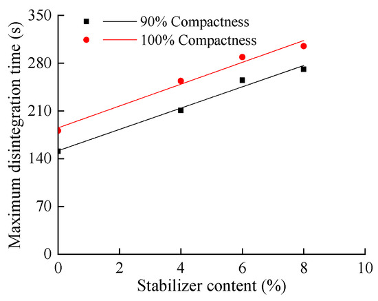 From Figure 13, the stabilized silty clay showed an almost linear increase in the maximum disintegration time, considering varying contents of lime and different soil compactness. Hence, the relationship could be fitted as expressed:
