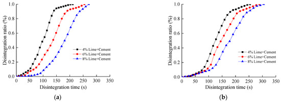 The addition of lime contributes to cementing the fine soil particles into a mass, and the proportion of sticky particles gradually increases [26,27]. The disintegration time of all the mixed soils with lime increased by 8%, corresponding to the addition of 1% in lime content. It should be noted that lime content should not be too large due to the marginal effects and engineering costs.
