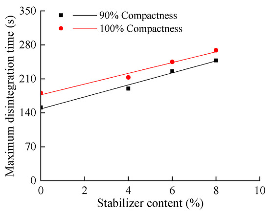 There is a good fit for the maximum disintegration time of lime or lime- and cement-stabilized soil, as shown in Figure 15. The disintegration resistance of soils stabilized by lime and cement was better than that of lime-stabilized soils at the stabilizer content, with an average increase of 26.4% for each 1% increase in stabilizer content at 90% compactness and 44.2% at 100 compactness. The fitting relationship can be expressed as follows: