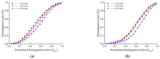 Disintegration ratio of silty clay stabilized by lime: (a) 90% compactness; (b) 100% compactness.