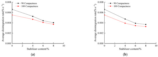 Compared with lime-stabilizer soil, the lower average disintegration rate of lime- + cement-stabilized soil implies better disintegration resistance under the same compactness and stabilizer content, as shown in Figure 18b. However, the soil sample using the larger combined additions presents a higher marginal effect, such that the effect of reducing the average disintegration rate is weakened. This once again demonstrated that the appropriate content of stabilizer needs to be investigated for application in engineering, and the addition of 6% may be a better scheme for soils stabilized by lime and cement.