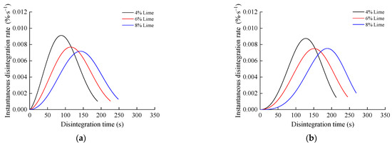 The average disintegration rate fails to capture the variation in the instantaneous disintegration rate in the disintegration process. Given that the disintegration evolution of the stabilized silty clay could be characterized by the Weibull distribution model, the instantaneous disintegration rate was calculated using the first derivatives of Equation (8) in combination with Equation (9):