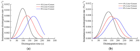 With the corresponding Weibull parameters substituted into Equation (13), the instantaneous disintegration rate of the stabilized silty clay was obtained, as shown in Figure 19 and Figure 20.