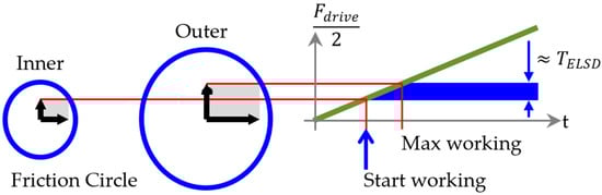 We created a control algorithm that predicts inner-wheel spinning during acceleration while turning by calculating the friction limit at which the inner wheel can be driven in real time []. A concept is designed for the ELSD clutch to engage based on the difference between the real driving force from the powertrain and the allowable driving force of the inner wheel, as shown in Figure 1.