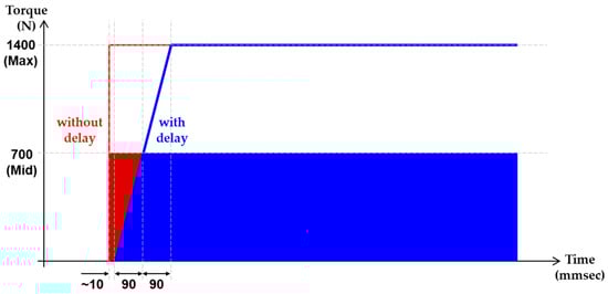 Figure 3 shows the engine torque, wheel speed, and ELSD engaging torque, respectively, with respect to time. The driving torque from the engine is presented in a black line. The inner-wheel speed is illustrated in a blue line. The green line represents the outer-wheel speed. The red line represents the engaging torque of ELSD. The time delay consists of two parts. One is the slew rate via the ELSD actuator, and the other is zero-order hold by the sampling time of the controller. The maximum delay by the actuator to ramp up to maximum torque is 180 msec. The sampling time of the control logic is 10 msec; therefore, the maximum total time delay is 190 msec, and the intermediate total time delay is 95 msec, as shown in Figure 4.