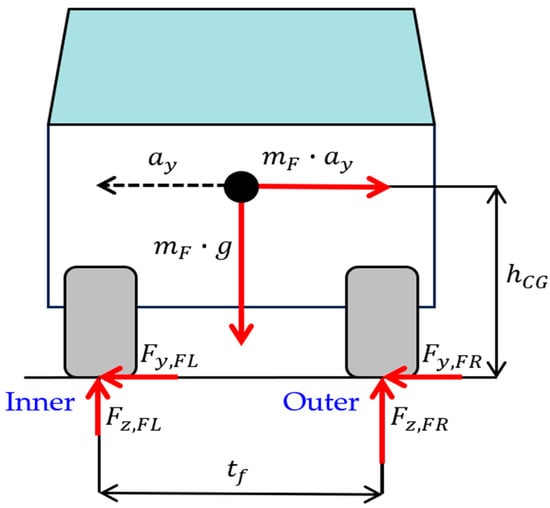 A control algorithm was created to predict inner-wheel spinning during acceleration while turning and calculate the friction limit at which the inner wheel can be driven in real time. The results were used to transfer the driving force acting on the inner wheel to the outer wheel by the amount that exceeds the calculated limit. In the model that calculates the inner-wheel friction limit in real time, the lateral acceleration sensor signal value was used as the input to calculate the load transfer through which the vertical load of the inner wheel could be estimated during turning, as shown in Figure 6. The inner-wheel friction limit was then calculated as the product of the friction coefficient of the road surface and the inner-wheel vertical load [].