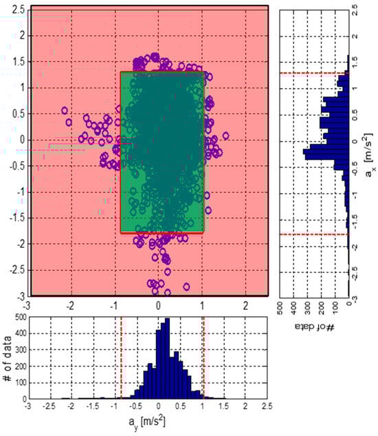 Another method uses acceleration sensors in the vehicle body to estimate tire–road friction [,]. Using vehicle acceleration sensors to convert the acceleration of the center of mass into sprung mass acceleration to calculate tire acceleration enables the estimation of the tire–road friction coefficient by calculating the dynamic tire force and effective vertical force, considering the amount of load transfer. This approach considers the amount of slip that reaches the maximum tire force and calculates the effective dynamic tire force, which is similar to the friction estimation technique proposed in this paper. However, this method involves calculating the friction coefficient using only the acceleration of the vehicle. Therefore, the calculated value is used as is in stable situations; in sections where there is no rapid acceleration, the problem of the friction coefficient falling to a lower value than the actual friction coefficient can occur. Additionally, it has only been verified in certain driving conditions where the vehicle brakes while driving straight. It is necessary to verify whether the friction estimation is also effective in various driving environments with different road conditions and in situations where there is significant lateral acceleration due to turning. In turning situations where both longitudinal and lateral accelerations increase, leading to an increase in both longitudinal and lateral tire forces, the accuracy of tire–road friction estimation decreases if the effective normal acceleration cannot be calculated. Therefore, the aforementioned method needs additional strategies to accurately estimate the friction coefficient in stable vehicle states, which is a section where longitudinal and lateral accelerations are small.