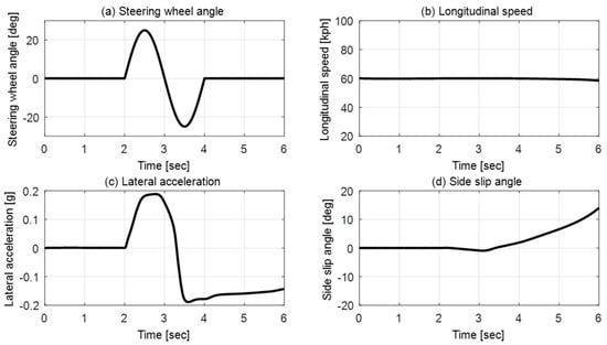 Simulation studies. (a) Steering wheel angle; (b) longitudinal speed; and (c) lateral acceleration; (d) side slip angle.